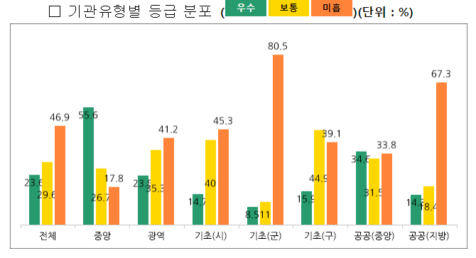 구분 | 기관유형 | 우수 | 보통 | 미흡 | 1 | 중앙행정기관(45) | 25 | 12 | 8 | 2 | 광역자치단체(17) | 4 | 6 | 7 | 3 | 기초자치단체 ‘시’(75) | 11 | 30 | 34 | 4 | 기초자치단체 ‘군’(82) | 7 | 9 | 66 | 5 | 기초자치단체 ‘구’(69) | 11 | 31 | 27 | 6 | 중앙행정기관 산하 공공기관(130) | 45 | 41 | 44 | 7 | 광역자치단체 산하 공공기관(49) | 7 | 9 | 33 | 합 계 | 110 | 138 | 219 |