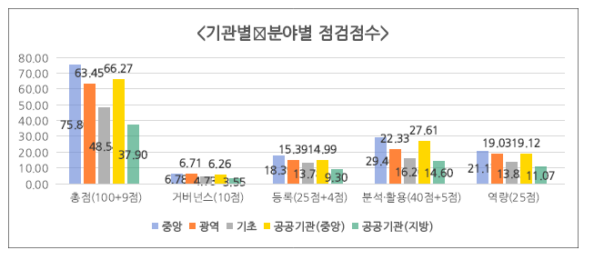 ○ 객관적이고 공정한 평가를 위하여 데이터 업무경험이 풍부한 정보통신기술(ICT)·법·행정·경영 분야의 민간전문가로 실태점검단(19명)을 구성하여 운영하였다. □ 이번 실태점검에서는 ‘데이터기반행정 거버넌스’, ‘공동활용데이터 등록’, ‘데이터 분석·활용’, ‘활용역량 강화’ 등 4개 분야 12개 세부지표에 대한 점검이 진행됐다. □ 2022년 데이터기반행정 실태점검 결과를 기관유형별로 종합해 보면, 중앙행정기관, 광역자치단체 및 중앙행정기관 산하 공공기관이 기초자치단체 및 광역자치단체 산하 공공기관보다 데이터기반행정 운영수준이 상대적으로 우수한 것으로 나타났다. □ 분야별로는 ‘데이터기반행정 거버넌스’와 ‘활용역량 강화’ 분야는 비교적 양호하나, ‘분석활용’ 분야는 상대적으로 개선이 필요한 것으로 나타났다. □ 각 분야를 세부적으로 살펴보면 첫째, ‘데이터기반행정 거버넌스’ 분야에서는 데이터기반행정 인력 확충 및 데이터기반행정 책임관 임명 등을 전반적으로 충실히 이행한 것으로 나타났다. ○ 인사혁신처, 세종특별자치시, 전라남도 곡성군, 기술보증기금 등 116개 기관이 비교적 높은 점수를 받았다. □ 둘째, ‘공동활용 데이터 등록’ 분야에서는 법령에 따라 지정된 공동활용 데이터에 대해 기관 대부분이 등록을 이행하였고, 자율등록 데이터 등록 건수 및 기관수는 작년 대비 증가하였다. ○ 행정안전부, 경기도, 대전광역시 서구, 광주광역시도시철도공사, 국민건강보험공단, 한국고용정보원 등 73개 기관이 비교적 높은 점수를 받았다. □ 셋째, ‘데이터 분석·활용’ 분야에서는 데이터 분석·활용 과제 발굴률이 높고 데이터 분석·활용 정책 반영 실적도 우수한 것으로 나타났다. ○ 기상청, 충청남도, 충청북도 음성군, 신용보증기금 등 93개 기관이 비교적 높은 점수를 받았다. ○ 다만, 지표 개선을 위하여 다수기관이 협업하는 분석과제를 적극적으로 추진할 필요성이 있는 것으로 보인다. □ 마지막으로 ‘활용역량 강화’ 분야에서 교육 실적 등은 양호하며 많은 기관이 구성원의 데이터 활용역량을 진단하고, 개선계획을 수립한 것으로 나타났다. ○ 농촌진흥청, 부산광역시, 대구광역시 북구, 한국산업인력공단, 한국마사회, 중소벤처기업진흥공단 등 227개 기관이 비교적 높은 점수를 받았다. □ 행정안전부는 실태점검 결과를 행정안전부 누리집에 공개하는 한편, 데이터기반행정 활성화 분위기가 전 기관에 확산될 수 있도록 우수사례를 전파하고 우수기관에 대한 정부 표창을 수여할 계획이다. ○ 이와 함께, 미흡 기관에 대해서는 타기관과의 역량 격차 해소를 위해 수준별 맞춤형 교육을 지원하는 한편, 자료제출 최소화 등으로 점검 대상기관의 실태점검 부담을 완화하여 데이터기반행정 참여를 적극 유도할 예정이다. □ 정선용 행정안전부 정부혁신조직실장은 “데이터기반행정법 시행 이후 공공기관이 포함된 첫 실태점검을 통해 데이터기반행정 전반에 대한 인식을 높이고, 데이터기반행정이 기관내 문화정착을 확산하는 데 의미가 있었다”라며, “앞으로도 데이터 중심의 과학적 행정으로 정책의 실효성을 높이고, 국민들이 피부로 느낄 수 있는 공공서비스를 제공받을 수 있도록 지속적으로 노력해 나가겠다”라고 말했다. □ 점검목적 ○ 데이터기반행정 운영 전반에 대한 현황을 점검하고 정책개선에 반영하여 데이터기반행정 조기 정착 유도 □ 점검개요 ○ (점검대상) 467개 기관(중앙 45, 시‧도 17, 시‧군‧구 226, 공공기관 179) ○ (대상실적) ’21.11월~’22.9월까지 기관의 데이터기반행정 운영현황 ○ (기간‧방법) ‘22.10월~12월(기관 자체점검 : ~9월, 점검단* 평가: 10~11월) * 데이터 분야 민간전문가로 구성된 실태점검단(19명)에서 평가 및 점수 부여 ○ (점검분야 및 지표) 4개 분야의 12개 세부지표(정량‧정성지표) 4개 분야(배점) | 점검지표(배점) | 1. 데이터기반행정 거버넌스(10) | ‣ 관리체계 정립(부기관장이상 회의, 예산, 인력, 내외부 협의체 등) (10) | 2. 공동활용 데이터 등록(25) + 가점(4) | ‣ 데이터 지정 등록 이행률(10) ‣ 공동활용 데이터 등록‧제공(15) | 3. 데이터 분석·활용(40) + 가점(5) | ‣ 데이터 분석 및 정책활용 실적(20) ‣ 데이터기반행정 우수사례 (20) | 4. 활용역량 강화(25) | ‣ 데이터 활용역량 진단 및 개선계획 수립(10) ‣ 교육 참여 실적(10) ‣ 데이터기반행정 활성화 문화 조성(5) |